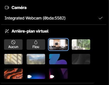 Un menu s'ouvre, vous pouvez choisir un arrière plan virtuel dans la liste ou flouter simplement l'arrière de votre vidéo :